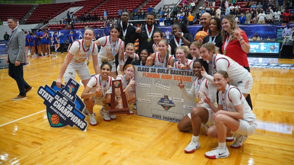 had as good of a tournament in Lakeland as anyone. She scored from everywhere on the court, and she rebounded, ran the floor, and did everything on an elite level. She left no doubt in each game who the best player on the court was and she made it look easy. She and teammates placed a target on themselves from the onset with their mantra “State Championship or bust.” Placing that sort of pressure on yourself can be hard, but that’s what elite players want – to be placed in a position of having to perform at an elite level – night in and night out. Barrett (picture below- bottom row on left) and company passed the test. The picture below is the proof.